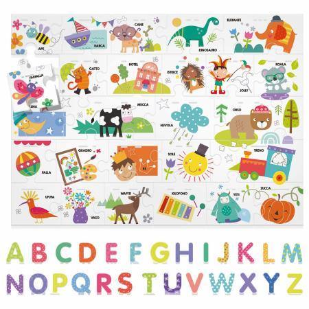 I bambini ricompongono il grande puzzle illustrato e imparano a riconoscere l'alfabeto e le prime parole, grazie anche alle originali lettere sagomate che si incastrano in verticale, in modo autocorrettivo.