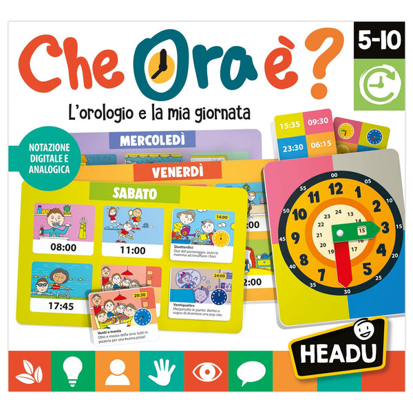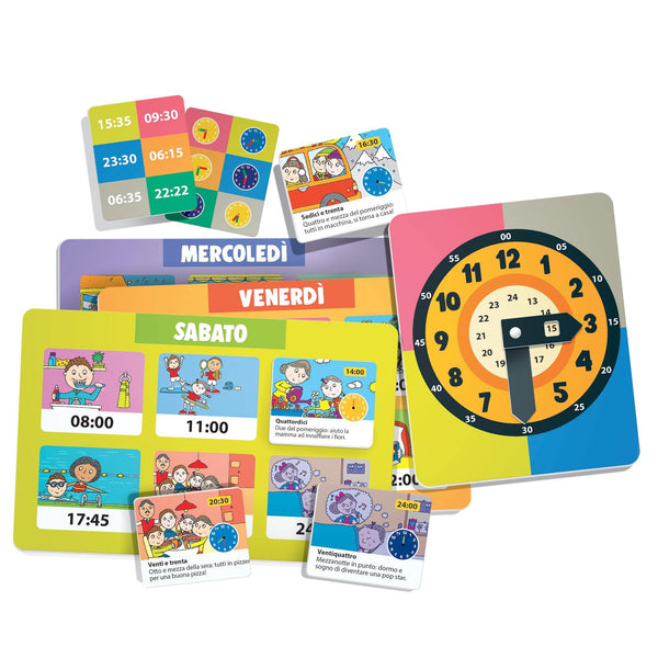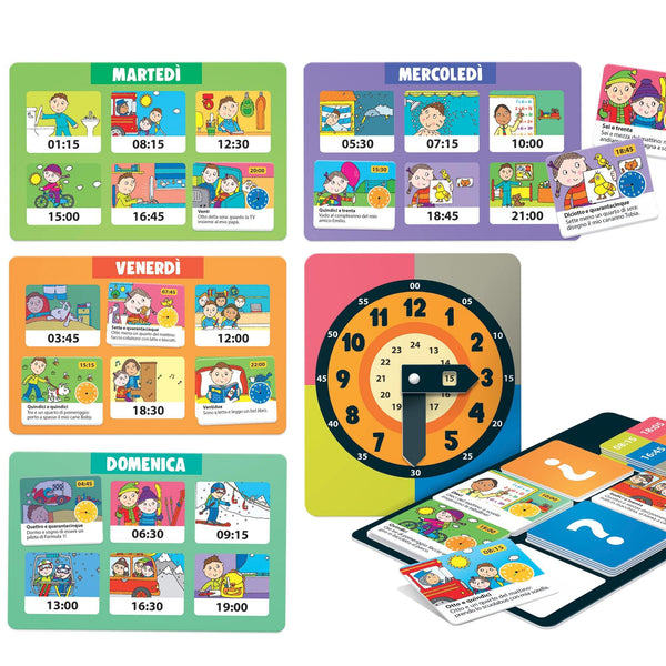 Ore 16:00, quattro di pomeriggio: è il momento di giocare con questa divertente tombola che, attraverso le azioni dei giorni della settimana, ci insegna a leggere e a indicare ore e minuti in versione analogica e digitale ed in altri modi convenzionali!