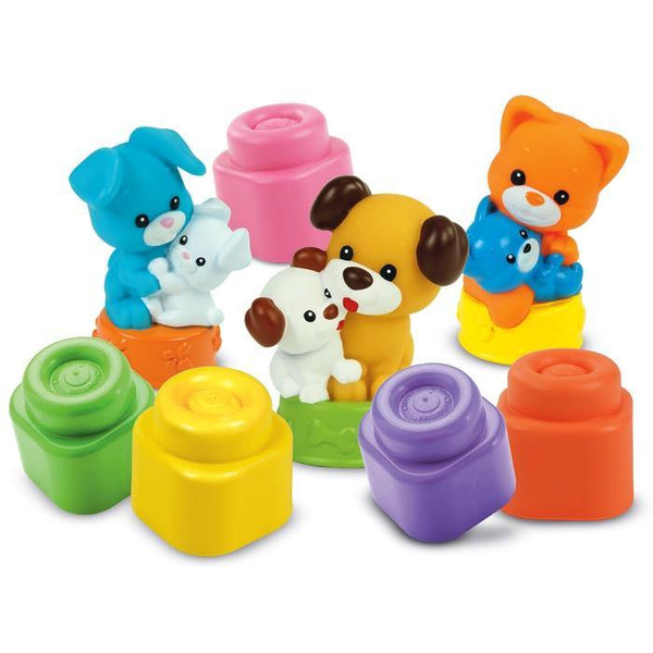 Con 3 coppie di mamme e cuccioli domestici e 6 morbidi mattoncini Clemmy per stimolare la manualità e l'immaginazione.